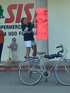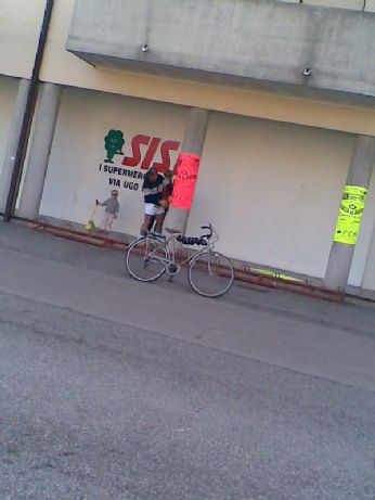 Lui bar, alcol, bicicletta, capelli indietro, pile, braghette curte.