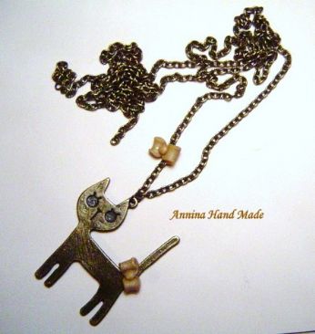 Collana (lunghezza a piacere) con micio color bronzo, disponibile in versione semplice o coi fiocchettini..del colore che volete