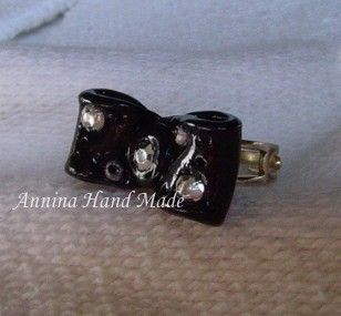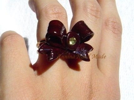 Anello con base argentata regolabile e fiocco marrone con strass lavorato a mano