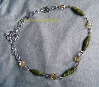 Collana con catena argentata, simil perle sfaccettate ambrate, perle lunghe swirl realizzate a mano e chiusura laterale a T