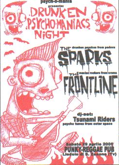 domenica 14 maggio 2006 - ore 14:04 LA VALVOLINA DEL FRIGO E’ ROTTA Da quando abbiamo quell’ascia in saletta I FRIGORIFERI ESPLODONO, I NEON ESPLODONO, I SEDILI BRUCIANO E LA GENTE SVIENE AL SUOLO GRIDANDO "SCUSA SIGNORE!!!" !!!STASERA THE SPARKS ALLA GABBIA!!! LEGGI I COMMENTI (3) - PERMALINK sabato 13 maggio 2006 - ore 13:48 IN-FEDELI INFEROCITI LEGGI I COMMENTI (4) - PERMALINK venerdì 12 maggio 2006 - ore 18:11 OH CRISTO SANTO...L’UNICUM!!! LEGGI I COMMENTI (10) - PERMALINK martedì 9 maggio 2006 - ore 22:35 MIGLIOR COGLIONE NON PROTAGONISTA Dal Gazzettino: TAMPONA UN AUTO E SI UCCIDE GETTANDOSI IN CANALE...AVEVA PASSATO LA SERATA FACENDO IL GIRO DEI BAR CON GLI AMICI! LEGGI I COMMENTI (5) - PERMALINK lunedì 8 maggio 2006 - ore 20:38 WEEK-END LEGGI I COMMENTI (8) - PERMALINK lunedì 1 maggio 2006 - ore 12:41 PERIZOMI VOLANTI - Punky Reggae Pub -Un ringraziamento a chi è venuto...in particolare a iena e tripudio,gli unici a muovere il culo da padova! -La macchina di popo è ancora parcheggiata in un canale a vicenza!(lha ripresa e non aveva assolutamente nulla...a parte un gufo incendiato nel radiatore...) IL GIORNO DOPO (appena svegli): LEGGI I COMMENTI (18) - PERMALINK venerdì 28 aprile 2006 - ore 17:29 I LOVE YOU BABY LEGGI I COMMENTI (11) - PERMALINK giovedì 27 aprile 2006 - ore 12:09 PSYCHO PARTY SABATO 29 APRILE - PUNKY REGGAE PUB LIEDOLO DI SAN ZENONE (TV) ![]() !!!INGRESSO GRATUITO!!! COMMENTA (0 commenti presenti) - PERMALINK giovedì 20 aprile 2006 - ore 11:15 Bevi! LEGGI I COMMENTI (9) - PERMALINK giovedì 13 aprile 2006 - ore 19:20 Disintegrate You Bastard - Punky Reggae Pub LEGGI I COMMENTI (5) - PERMALINK > > > MESSAGGI PRECEDENTI |