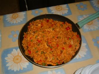Ieri sera un salto in Equador. Riso con pollo. Una ricetta assai gustosa. Pollo bollito, poi ripassato in pentola con riso bollito (nel brodo del pollo), peperoni, carote, piselli e uvetta. Il tutto colorato con l’