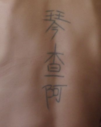Soddisfattissima del risultato ancora al giorno d’oggi, sono pero’ sempre rimasta con il dubbio se il tatuaggio avesse veramente un senso o no in Cinese (sto evitando con tutte le mie forze di recarmi in Cina ovviamente )....dubbio che mi e’ stato definitivamente tolto qualche giorno fa quando, grazie ad un nuovo/a conoscente del sito che studia il Cinese (continuo a non fare nomi...anche se lui/lei sa chi e’ ), sono stata indirizzata ad un sito che "traduce" il proprio nome in Cinese. Indovinate un po’?????
