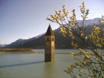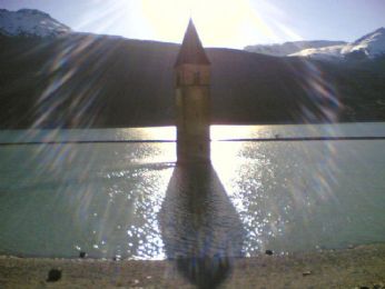 Lo spiazzo era un punto turistico-informativo, con un enorme plastico della vallata com’era prima che venisse creato il lago di Resia, il lago infatti non era all’origine grande come quello attuale, ma molto più piccolo e per poterlo ingrandire per la produzione di corrente elettrica, erano stati rasi al suolo decine di paesi e di fattorie. Ultimo ricordo di tutto quello che è stato cancellato dall’uomo, un campanile romanico, originariamente torre di avvistamento romana, lasciato lì, come un monolite, che sembra sorgere dal nulla, bellissimo e triste ricordo.