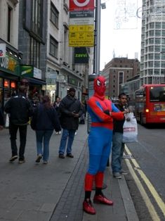 Spiderman che aspetta il bus