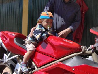 ecco a voi mio nipote, la futura colonna portante del motociclismo italiano nell’attesa che gli crescano un po’ le gambe, fa pratica con la moto dello zio