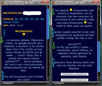 " tirarmela?? io?? vedi, è questo il problema ... NON riuscite proprio a credere che una ragazza semplicemente non sia interessata a voi nello specifico (mica vale per tutti, ovviamente ci sono persone con cui mi fa molto piacere scrivere, parlare, uscire, etc) pur di non ammettere che semplicemente non m’interessate per qualche motivo normalissimo, iniziate a dire stronzate del tipo "TE LA TIRI" "MA CHI TI VUOLE" "LO SO CHE IN REALTA’ SEI UN CESSO" "MA SEI LESBICA?" etc etc