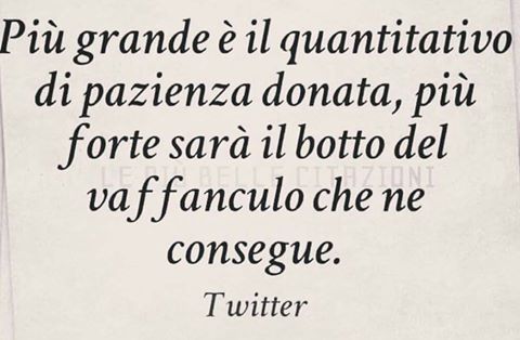 Per una persona pessimista, e’ vuoto a metà. Per l’ingegnere, e’ due volte più grande del necessario. Autocritica: "Grana hai rotto il ca22o co’ tutte ’ste menate. Smettila di spurgare odio nei post." BRATTY = Describes a child(alwayas an adult n.d.emmegi.75) who is spoiled, whiny, throws tantrums, and always wants things his way. ![]() Se tu e io ci scambiamo un dollaro, restiamo sempre con un dollaro ciascuno. Se invece ci scambiamo le idee, dopo tu ne hai due e io pure. Lo volevate? Ecco, per chi me lo ha chiesto, è giunto il momento di soddisfare quel trepidante e rischioso desiderio di leggere ciò che scriverò. Commentate, lamentatevi, ma io avevo avvisato via speedy... Le immagini sono prese dal web e saranno subito rimosse se chi, avendone il copyright, lo chiederà. emmegi.75@sudinoinemmenounanuvola.it venerdì 17 febbraio 2017 - ore 20:15 LEGGI I COMMENTI (1) - PERMALINK giovedì 2 febbraio 2017 - ore 08:38 gividì!! ![]() COMMENTA (0 commenti presenti) - PERMALINK lunedì 16 gennaio 2017 - ore 17:32 #bluemonday. oppure Ma sta per finire COMMENTA (0 commenti presenti) - PERMALINK lunedì 9 gennaio 2017 - ore 11:07 che bello! https://www.facebook.com/livemap Tutte le dirette streaming..fantastico Un nuovo motivo per non uscire più di casa e non relazionarsi con il mondo. COMMENTA (0 commenti presenti) - PERMALINK domenica 8 gennaio 2017 - ore 18:38 Vicky Cristina Barcelon Sul finire di queste ennesima vacanze natalizie (le tue, mica le mie) stasera sono incappato in "Vicky Cristina Barcelona". Cazzo che film. La domanda a tutto è: "cazzo fanno questi per vivere? Esistono veramente?". La risposta purtroppo è sì, e la vicinanza di questi "viveur" è molto più ridotta di quanto la si percepisca. Travolto da una malefica tosse finesettimANALe, mi ritrovo a rimuginare su quanto a volte sia boccalone, per fiducia mal riposta a storie che non esistono, a candide punte di iceberg che galleggiano ostentando candore sostenuti da una sommersa massa di cioccolata che li alimenta e li sostiene copiosamente. Bravo Grana Ecce Bombo, vedi sotto la sostanza. Il vero problema è che avevo dei compiti da fare, e non li ho fatti tutti, anche se ho fatto tutt’altro che grattarmi i coglioni. Ciò mi rende nervosetto, misantropo e un po’ sociopatico. COMMENTA (0 commenti presenti) - PERMALINK venerdì 30 dicembre 2016 - ore 21:00 COMMENTA (0 commenti presenti) - PERMALINK venerdì 30 dicembre 2016 - ore 17:15 "risposta non cè, e forse chi lo sa, perduta nel vento sarà." Appunto, risposte che come gli spifferi di vento sgusciano via...ma oggi è chiaro che le motivazioni o le spiegazioni che sfuggivano al reale senso pratico oggi sono lampanti. Ho imbrigliato laria, e anche purtroppo lodore. Il miasma della verità nascosta per troppo tempo... https://www.youtube.com/watch?v=-w9EBTB8a3Y LEGGI I COMMENTI (1) - PERMALINK mercoledì 28 dicembre 2016 - ore 20:17 dopo una settimana di stravizi natalizi e zero attività fisica ho messo su solo mezzo etto Selfie autocelebrativo: I risultati sono altri... COMMENTA (0 commenti presenti) - PERMALINK martedì 20 dicembre 2016 - ore 08:10 Se... ...non è Natale per me la figura qua sotto la possiamo definire almeno come Avvento. "Sei arido". "No, sei tu che vivi nel mondo dei puffi autocelebrativi e autoreferenziali" Contrordine delle 15.25, mancavano finestre, cazzo. COMMENTA (0 commenti presenti) - PERMALINK domenica 18 dicembre 2016 - ore 11:02 che bella la palestra, è da ieri che ad ogni movimento la mia espressione è questa: "cosa ci fai qua? Cè la nebbia, e la nebbia TI ODIA" LEGGI I COMMENTI (2) - PERMALINK > > > MESSAGGI PRECEDENTI |