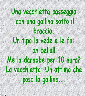 venerdì 30 novembre 2007 - ore 09:33 Schegge di vita: monologo dentro in macchina quando si è in ritardo e tutti gli imbranati ti capitano davanti ... "Che kakkio fa questo? ... ma dimmi te se proprio questa mattina devo trovarmi tutti gli imbranati.. si bravo bravo! Vai piano, si, se no rischi la multa... se avevo il triciclo facevo prima... e adesso?! Che cavolo sta facendo ?! ...No, non può essere?! ... ma sei tu che hai la precedenza!.. cavolo si ferma sto quà..." Alla fine mi sono messa il cuore in pace e mi sono messa ad ascoltare la musica .. Conclusione: sono arrivata in ritardo ... LEGGI I COMMENTI (4) - PERMALINK giovedì 29 novembre 2007 - ore 15:01 LEGGI I COMMENTI (1) - PERMALINK mercoledì 28 novembre 2007 - ore 12:13 Schegge di vita: quando il cane ha capito cosa gli piace... E concepibile che nella lettera a Babbo Natale debba chiedere calzini nuovi visto che il mio cane fido bau me li ciula tutti... ![]() LEGGI I COMMENTI (2) - PERMALINK mercoledì 28 novembre 2007 - ore 12:13 Schegge di Vita: karaoke in macchina o demenza mentale?!... E concepibile cantare in macchina a squarcia gola con lautoradio spenta .. immaginare di essere una cantante con tanto di platea che esulta ... essere in preda alla fantasia e voler accompagnare la voce di Mina nella sua canzone - Limportante è finire, cercare il Cd a più non posso e poi rendermi conto che anche se lavessi trovato avevo dimenticato lo sportellino dellautoradio a casa ...continuare a cantere scusandomi con la platea per il contrattempo... LEGGI I COMMENTI (3) - PERMALINK martedì 27 novembre 2007 - ore 10:32 ![]() Barbie Hannibal COMMENTA (0 commenti presenti) - PERMALINK martedì 27 novembre 2007 - ore 10:19 Test Veloce Giusto x perdere un po’ di tempo.... Quando saprai la tua frase, mettila nel post ... 1) Scegli il mese in cui sei nato/a: Gennaio>> ho preso a calci Febbraio>> ho amato Marzo>> ho fumato Aprile>> ho baciato Maggio>> ho strozzato Giugno>> ho assassinato Luglio>> ho ballato la Macarena con Agosto>> ho pranzato con Settembre>> ho ballato con Ottobre>> ho cantato a Novembre>> ho urlato a Dicembre>> sono scappato/a da 2) Scegli il giorno (numero) in cui sei nato/a: 1>> un pazzo 2>> un mostro 3>> un telefono 4>> una forchetta 5>> un Messicano 6>> un gangster 7>> il mio cellulare 8>> il mio cane 9>> il fidanzato della mia migliore amica 10>> il mio vicino di casa 11>> il/la mio/a prof di scienze 12>> una banana 13>> un gatto 14>> un pelouche 15>> una capra 16>> un sottaceto 17>> tua madre 18>> un cucchiaio 19>> me stesso/a 20>> una mazza da baseball 21>> un ninja 22>> Chuck Norris 23>> un coltello 24>> uno scoiattolo 25>> un calciatore 26>> mia sorella 27>> mio fratello 28>> un iPod 29>> un pennarello indelebile 30>> un lama 31>> uno sfollato 3) Scegli il colore della maglietta che indossi: Bianco>> Nero>> perchè è così che trascorro il tempo Rosa>> perchè NON sono omosessuale Rosso>> perchè me l’hanno detto le voci che sento Blu>> perchè sono sexy e faccio quello che mi pare Verde>> perchè mi odio Viola>> perchè sono forte Grigio>> perchè ero ubriaco/a Giallo>> perchè qualcuno mi ha offerto 1,000,000 di? Arancio>> perchè odio la mia famiglia Marrone>> perchè ero fatto Altro>> perchè sono un ninja Nessuno>> perchè non so controllarmi LEGGI I COMMENTI (6) - PERMALINK lunedì 26 novembre 2007 - ore 17:57 ![]() ...I’m so tired... - by Lalla - LEGGI I COMMENTI (3) - PERMALINK venerdì 23 novembre 2007 - ore 10:31 Schegge di vita: bilancia !!!! ... ![]() LEGGI I COMMENTI (3) - PERMALINK venerdì 23 novembre 2007 - ore 10:31 Schegge di vita: quando cè poca voglia di stare in uffucio... E concepibile che la mia collega mi veda uscire da lavoro, mi chiami al cell dopo 10 minuti e mi chieda "ma dove sei?" ![]() io: "Sono arrivata a casa, perchè?" ![]() lei: "ma se sono le 11.30 del mattino !! " e rendermi conto, solo in quel momento, di aver letto sullorologio le 12.30... LEGGI I COMMENTI (2) - PERMALINK giovedì 22 novembre 2007 - ore 16:56 Schegge di vita: quando pensavo che il nome Ernesto fosse uno dei più strambi ... ...Kakkio uno dei miei colleghi di Milano si chiama Eleuterio... LEGGI I COMMENTI (3) - PERMALINK > > > MESSAGGI PRECEDENTI |
