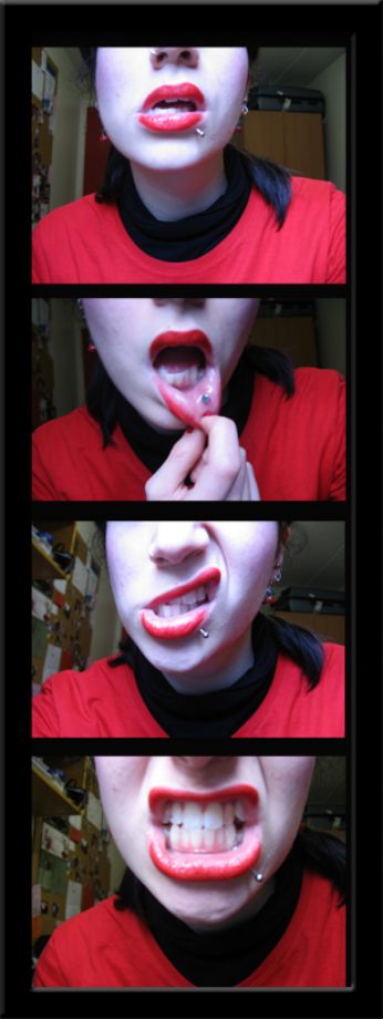 e tutto questo perchè ieri mi son fatta un nuovo piercing, ed è sul labbro, e fino alla settimana prossima devo tenere una barra enorme: questo vuol dire che per una settimana non uscirò e che continuerò a masticarmi la barra facendomi maliffimo...