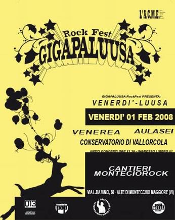venerdì 8 febbraio 2008 - ore 11:39 ![]() Questa sera al CRC di Abato Terme va in scena un VENERSI-LUUSA bello tosto con REVOLVER e RE DINAMITE. Da esserci eh! COMMENTA (0 commenti presenti) - PERMALINK martedì 5 febbraio 2008 - ore 13:02 Onestamente non ci speravo molto di poter rivedere i Metallica. Dopo il concerto padovano del 2004 e quello del 2006 all’heineken che purtroppo avevo dovuto saltare all’ultimo momento nonostante un pass procuratomi dal sempre mitico momo. Tra l’altro un grandissimo concerto a detta di chi c’era andato. E invece ieri è cominciata a girare la notizia: Bologna Arena Parco Nord - 22 luglio 2008. Chissà come faranno con i volumi che a Bologna sono tacchenti con ste cose, ma è una bella location comunque. Io e il dido ci siamo, pure il Simo/Venerea. A sto punto organizziamo una metallikexpedition e non se ne parla più gazzo. Monster! LEGGI I COMMENTI (15) - PERMALINK lunedì 4 febbraio 2008 - ore 14:18 Continuano le scorribande dei PORNOPILOTSLINK tra le radio dellitalico stivale, sia via web sia via etere ![]() Pare che la nostra GENERATION sia stata la canzone più passata nellultimo mese allinterno della trasmissione Bassa Frequenza condotta dal diggei LucaBas il giovedì sera dagli studi della bergamasca RADIO PIANETA. E un giretto gliela farà fare anche questo giovedì. LEGGI I COMMENTI (3) - PERMALINK sabato 2 febbraio 2008 - ore 10:24 ![]() Stasera festone/carnevalata al WAHWAH CLUB al TAG in Via Giustizia 19 a Mestre! Quindi live dei PORNOPILOTSLINK verso le 23 (niente DIET KISS influenzati) e a seguire djset a mitraglia con DANIELE REALE, BOGALOO ROBERT e il grandissimo CHECCo MERDeZ più qualche ospite a sorpresa! Come al solito con il WahWah verrà fuori una figata. Il posto è ficco, la gente giusta e la quantità di ciccia notevole. Per arrivarci: MAPPA PS: ah! e grazie mille a tutti quelli che ci hanno ascoltati ieri in radio e hanno mandato una mitragliata di sms, tanto che la maggior parte non sono stati letti per motivi di tempo. Grande Willy! LEGGI I COMMENTI (10) - PERMALINK venerdì 1 febbraio 2008 - ore 10:14 ![]() Oggi pomeriggio dalle 17.00 alle 18.00 i PORNOPILOTSLINK saranno su RADIO BASE POPOLARE NETWORK ospiti nel programma I MANIACI dei mittico Willy, storico diggei ex Sherwood, mattatore di miriadi di serate nei mejo locali prima nel padovano e ora nel veneziano. Da semplice ospitatina per la presentazione dell’EP la cosa si è tramutata in co-conduzione di quell’ora di programma, con mille chiacchiere e porno-selezione di brani da mandare in onda che il mitico Piva sta organizzando. Ci sarà qualche chicca eh. Il numero per mandare gli sms è 339 33 33 379 e me ragomando, bombardare come al solito!!! Appuntamento quindi sulle frequenze FM: 99.150 - 93.550 - 107.4 per le provincie di PD, VE e TV. Oppure trovate le istruzioni per ascoltare in streaming audio cliccando QUA. ![]() Stasera invece GIGAPALUUSA ROCKFEST in trasferta presso i CANTIERI MONTECIOROCK. Seratona con: VENEREA AULASEI CONSERVATORIO DI VALLORCOLA LEGGI I COMMENTI (4) - PERMALINK giovedì 31 gennaio 2008 - ore 10:43 ![]() Ho iniziato l’ascolto dei Teatro degli Orrori. Diciamo che di mattina andando a lavorare sono una cosa che scuote parecchio ![]() Parte stasera un weekend all’insegna finalmente del rocckenrolle! A parte i PORNOPILOTSLINK che domani saranno in radio e sabato al Wahwah. Poi c’è sempre domani un bel gigarockfest in trasferta nel vicentino. Ma di queste cose renderò conto più diffusamente quando è ora. Stasera invece doppio appuntamento, sempre nell’altapadovana: GREENWICH PUB SOVIET LADIES + HERITAGE MOTEL RICKYS PUB BRA DEEP O’MISSILE + BOXMEN PS: legio caro, sto giro ghea go fata, ma te tachi essare esoso co ste prove ![]() LEGGI I COMMENTI (1) - PERMALINK sabato 26 gennaio 2008 - ore 18:50 Stasera Il Teatro degli Orrori alla Gabbia. Sono molto tentato. E ieri bel concertone dei pornopiloti eh ![]() LEGGI I COMMENTI (7) - PERMALINK venerdì 25 gennaio 2008 - ore 10:30 ![]() Stasera si torna al mitico VINILE a Rosà (VI), uno dei locali storicamente rocchenrolle, per antonomasia. Esiste e resiste da una vita e da quando ho il lume della ragione ho sempre saputo che là c’è rock. Questa sera quindi noi PORNOPILOTSLINK faremo la nostra parte assieme ad un gruppo giovine e mooolto interessante che aprirà la serata: i THE JUNCTION. Prima e dopo i concerti e fino alle 4am, DJset rock affidato a BELSEN, il cantante tarantolato dei Soviet Ladies nonché personaggione del cittadellese che ci stupirà con qualche chicca ’90s qua e la. Inizio concerti verso le 22.30/23. Non sai come si arriva al locale? Ecco la MAPPA! That’s all folks. LEGGI I COMMENTI (5) - PERMALINK giovedì 24 gennaio 2008 - ore 15:29 ![]() Ieri sera ottima cena in casa Nicola/Venerea per una riunione sediziosa del consiglio direttivo L’A.C.M.E. allargato a me e a un altro gradito ospite. Ovviamente le bottiglie di ottimo vino erano in numero superiore ai commensali, ma nessuno si è tirato indietro mi sembra. E siamo stati bravi a discutere quasi seriamente di tutti gli argomenti sul tavolo (come che se dise). Mancava la Manu e il mitico Ciuffo/Marenduzzo, ma ne sono successe comunque anche senza di lui ![]() E domani un APPUNTAMENTO a cui non bisogna mancare! LEGGI I COMMENTI (3) - PERMALINK lunedì 21 gennaio 2008 - ore 10:30 ![]() La retata del sabato mattina da Essemusic con Fabio e il Piva, tanto per cambiare si è conclusa spendendo sghei. Ma soprattutto come da copione sono partito con la ferma convinzione di prendere delle cose (effetti) e sono tornato con tutt’altro: una chitarra acustica. Ottimo rapporto qualità prezzo e suona veramente bene: una CORT SFX-6R NAT in palissandro. Chitarra che, come ho scoperto poi a casa, ha una gattata notevole di cui non immaginavo neanche l’esistenza: l’accordatore integrato! Spaziale. ![]() Quella che avevo, buona ma un po’ vecchiotta, l’ho prontamente messa in vendita sfruttando la sua p