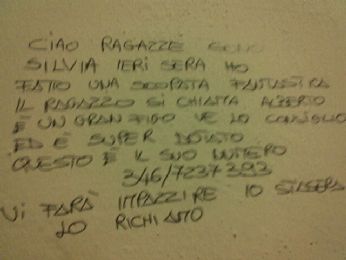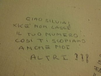 venerdì 10 novembre 2006 - ore 12:17 Its my proud that make me distant. Entrare in unaula in una giornata grigia, freddina, che sancisce larrivodellinverno, del mio inverno..trovarsi davanti a chi nel passato hai venerato, far i conti coi ricordi, intensi, cattivi, con gli errori, le delusioni soprattutto..vedere come le strade si sono divise, inevitabilmente. Nord e sud, positivo e negativo, bianco e nero..Qualsiasi cosa rimanda al suo contrario, senza via di fuga, senza possibilità di rendenzione. Capire che forse la parte giusta non è dove dovrebbe stare. Ma trovare poi un piccolo mondo dove vive un sogno..un sogno che forse continuerà a vivere solo lì dentro, ma cè, è grande, potrebbe esplodere... LEGGI I COMMENTI (5) - PERMALINK giovedì 9 novembre 2006 - ore 12:22 MI SENTO REALIZZATISSIMA! Scappo a lezione...troppa felicità potrebbe disintegrarmi. LEGGI I COMMENTI (2) - PERMALINK giovedì 9 novembre 2006 - ore 11:56 sottotitolo -Le Cagate Non Finiscono Mai- Lavoro: Non so come possa farti sentire, ma nella tua vita precedente eri di sesso MASCHILE ed facevi lo SCRIBANO .. Zona: Vivevi a GIAVA, nel sud-est asiatico Periodo storico: antica grecia Un breve profilo psicologico della tua vita precedente: Carattere curioso, inventivo, sempre in grado di tener testa alle situazioni più difficili. Talento per il teatro, un attore nato Commento: Sempre meglio della balena dal corpo tozzo e pisciforme....che poi mi chiedo come potrebbe essere una balena se non pisciforme.....bah... COMMENTA (0 commenti presenti) - PERMALINK mercoledì 8 novembre 2006 - ore 15:44 Quando si svegliò, il dinosauro era ancora lì! BUhahahhahaUIHuhaHuahuah. La micky si che sa rendere merito alle persone! Lei sì che le sa descrivere con efficacia e raquanta efficienza! Sto ancora ridendo. Detto questo passiamo alla parte seria. Che non esiste... Perchè dovrei studiare e invece non ne ho voglia. Che stranezze mi succedono ultimamente... Continuo a incantarmi...scemo.... ![]() LEGGI I COMMENTI (2) - PERMALINK lunedì 6 novembre 2006 - ore 22:47 It really didn’t make sense. Constatazioni del week end: -il malibù non va più giù. Peccato. Ma tanto non sono troppo delicata in fatto di alcool...sopperirò questa perdita in qualche modo. Ho già una mezza vagonata di idee. -maledetto filtro, dopo anni e anni di attesa devi ancora arrivare. Mieto vittime a nastro, non se ne può più. O meglio, gli altri non ne possono più. -piango solo dall’occhio destro, difetto di fabbrica forse. E’ un pò fastidioso però. -i pranzi nelle famiglie allargate sono già più sopportabili di un qualsiasi incontro con un qualsiasi parente naturale. Dovessero durare giornate intere, sarebbero cmq più rilassanti.. -gli argomenti non sono mai abbastanza. -non riuscirò mai a svegliarmi ad ore decenti. Bilancio: negativo. Chi l’avrebbe mai detto. LEGGI I COMMENTI (6) - PERMALINK lunedì 6 novembre 2006 - ore 21:49 La gente sta impazzendo ![]() ![]() Consiglio: ![]() Risposta: ![]() COMMENTA (0 commenti presenti) - PERMALINK venerdì 3 novembre 2006 - ore 21:13 Vorrei solo respirare. ![]() COMMENTA (0 commenti presenti) - PERMALINK mercoledì 1 novembre 2006 - ore 21:18 Goodbye my darling Mamma, sappilo, papà sappilo, spritzini tutti sappilo anche voi.... Non posseggo più un fegato...farsi trovare dalla nonna abbracciati al mobile in ceramica e convincerla di aver mal di pancia...non ha prezzo. No, un piffero, il prezzo è il mio fegato. E il mio rene, e una cornea. Il mio alcolismo pretende parecchio ultimamente... La nonna me lo diceva sempre, non so cosa ma qualcosa diceva. Non ricordo la cronologia, ma gli eventi sì. E una cosa posso dire, grazie. Grazie perchè è filato tutto liscio. E perchè..perchè lo leggi nellaltro blog. E voi no, gne! LEGGI I COMMENTI (8) - PERMALINK lunedì 30 ottobre 2006 - ore 14:30 L’hai visto il camion dei pompieri? Mattinata esaltante, la quotidianità del Paese è stata stravolta..e io mi sono chiusa in casa, blindata, memore degli avvenimenti di un anno fa e con poca voglia di farmi fare lo scalpo.. Oddio, la mamma mi controlla il blog..adesso ho paura, verrà a sapere che mi faccio le canne e che tiro i mozziconi sulla macchina di Sergio. Paura. Poi, sempre stamattina, son schizzata..e son andata a prendere il piccoletto.... ![]() Mi congedo. Salve. LEGGI I COMMENTI (26) - PERMALINK mercoledì 25 ottobre 2006 - ore 23:16 Bastardo figlio del niente ![]() COMMENTA (0 commenti presenti) - PERMALINK > > > MESSAGGI PRECEDENTI |