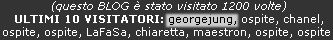 Sono un ragazzo normale, appassionato di musica, cinema, fotografia e altre cose. Mi ritengo una persona leale e sincera, precisa nelle cose che faccio; per contro però a volte posso risultare un pò pesante in situazioni che possono presentarsi difficili. D’altronde nessuno è perfetto, no? ...mi trovate anche su MYSPACE... martedì 11 dicembre 2007 - ore 08:40 Credi in un Destino alle mie domande domande su di te, il destino gioca sempre su di me, su di me. E credimi quando ti guardo e poi mi illudo, in viaggio da sempre, in mare con nessuno; navigando forse per un arrivo non sarà poi cosi un tragico destino. Corri in fretta e te ne vai, dai procedi verso me, non ci sei, non ci stai, il tempo passa e tu lo sai; Lascia il gioco ora o mai, dai che aspetti cosa fai, vieni qui, qui da me, un destino io e te. Credimi quando io vedo il tuo cammino, così pallido e spento in un respiro, navigando forse per il mio destino scoprirai un mondo asssai più vivo. Corri in fretta e te ne vai, dai procedi verso me, non ci sei, non ci stai, il tempo passa e tu lo sai; Lascia il gioco ora o mai, dai che aspetti cosa fai, vieni qui, qui da me, un destino io e te. [music and lyrics by Mattia Candian] Copyright S.I.A.E. LEGGI I COMMENTI (3) - PERMALINK venerdì 7 dicembre 2007 - ore 11:06 TOUCH ME, TOUCH ME NOW !!! ![]() LEGGI I COMMENTI (8) - PERMALINK giovedì 6 dicembre 2007 - ore 12:23 DROGATO DAI DAFT PUNK E RITORNO AL FUTURO !!! LEGGI I COMMENTI (3) - PERMALINK martedì 4 dicembre 2007 - ore 13:30 TI VOGLIO E TI AVRO’ !!! ![]() PRESTO SARAI MIA LEGGI I COMMENTI (5) - PERMALINK giovedì 29 novembre 2007 - ore 12:14 1200 visite ![]() ...grande vecchio!!! LEGGI I COMMENTI (7) - PERMALINK mercoledì 28 novembre 2007 - ore 12:03 INESCO MAGAZINE !!! ![]() ![]() ...le mie care... ![]() ...Matt Bass & Pier Vox... ![]() ... MC Matt & Nick Napolitano... ![]() ...Libidomeccanica Band... LEGGI I COMMENTI (3) - PERMALINK mercoledì 28 novembre 2007 - ore 11:00 FASHION FRIDAY !!! Le nostre ragazze hanno sfilato lasciando il pubblico senza fiato. ![]() ![]() LEGGI I COMMENTI (3) - PERMALINK lunedì 26 novembre 2007 - ore 10:55 Happy Birthday Laura! ![]() ...Mercoledi 21/11/2007... ...Auguri Laura ...LEGGI I COMMENTI (4) - PERMALINK sabato 24 novembre 2007 - ore 19:12 CI SONO PERSONE CHE NE FERISCONO ALTRE MA NON VENGONO MAI FERITE ANZI TROVANO SUBITO LA FELICITA’. CI SIAMO NOI CHE NON FERIAMO NESSUNO E CI IMPEGNAMO A REGALARE DEL BENE ALLE PERSONE E DA QUESTE RICEVIAMO SOLO DOLORE E GROSSE DELUSIONI. PERCHE’ LA VITA E’ COSI INGIUSTA? IO NON VOGLIO TOGLIERE NIENTE ALLE PERSONE CHE NON MERITANO, VORREI SOLO CHE ANCHE NOI TROVASSIMO LA FELICITA’ CHE CI SPETTA. LEGGI I COMMENTI (7) - PERMALINK martedì 20 novembre 2007 - ore 08:32 ILA, LORENZ, BETTY, BENE, CHIARA, ANGELA, FEDE, GIACOMO,MATTEO,LIVIO,MARTINO LA MIA FAMIGLIA, I MIEI COLLEGHI/E DI LAVORO, LIBIDOMECCANICA, FISTING JANET, STEREOTP, E TUTTE LE PERSONE CHE MI STANNO VICINE IN QUESTO DIFFICILE PERIODO. GRAZIE DI A TUTTE/I DI FAR PARTE DELLA MIA VITA. LEGGI I COMMENTI (5) - PERMALINK > > > MESSAGGI PRECEDENTI |