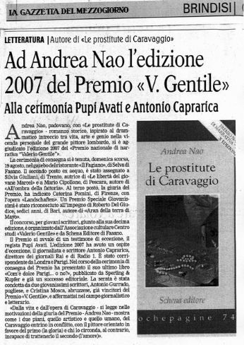 Il mio romanzo "LE PROSTITUTE DI CARAVAGGIO" ha vinto la decima edizione del Premio Nazionale di Narrativa “Valerio Gentile”.