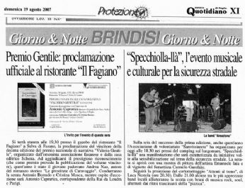 La premiazione si terrà a Selva di Fasano (BR) domenica 19 agosto 2007 alle ore 19.30, presso il Rist. “Il Fagiano”.