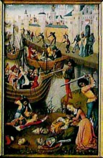 Uhm…Stasera ho intenzione di scrivere un po’ di cacchi miei a caso…così, tanto per dare a questo blog almeno la parvenza di un diario on-line…E per non sembrare soltanto una paranoica depressa sentenced dipendente! (Che poi effettivamente lo sono, ma non importa). Ebbene, per prima cosa dovete sapere che oggi ho firmato la mia condanna: la domanda di laurea è fatta, e adesso devo darci dentro col mio maestro sfigatello che d’ora in poi, lo so già, perseguiterà le mie notti insonni sottoforma di patacche fiamminghe, così come ama definirle una mia amica compagna di sventure, che con queste cose ha avuto a che fare prima di me…Cara…lei cerca anche di rassicurarmi, ma la verità è che ‘sta tesi è una noia mortale inutile, e ad alto potenziale dispendioso e sclerizzante. (Non è un post sensato, x cui posso anche scrivere parole inesistenti.) Ma siccome non mi sembra carino parlarne senza mostrare nemmeno una diapositiva… Ecco il mio affezionato in una delle sue tavole più sanguinolente: il massacro delle undicimila vergini!…(che poi è uno spreco non indifferente).