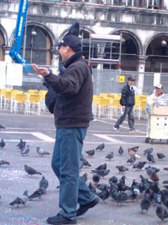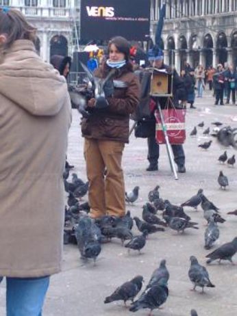 E poi, non felice, ho voluto immortalare I DEFICIENTI che hanno il coraggio di fare allaMMMMore con i piccioni puzzosi-sporchi-odiosi. Che poi, dico io....capisco che son animali, capisco che devono pur vivere e non si possono sterminare, ma da qua a tentare di baciarli, portarseli sul cappellino, o toccarli allegramente come fossero peluche della Trudi...beh, NE PASSA DI ACQUA SOTTO I PONTI!!! A voi il trio meraviglioso di EROI-PRO-PICCIONI.