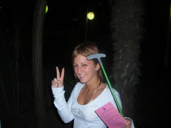 si opta allora per il minigolf, accontentando quel bambinone del Fish....io ce la metto tutta......MA SONO PROPRIO SFIGATO!!!!!come puo essere che agli altri 2 vanno tutte dentro mentre a me la pallina sembra scappare dall buca....fatto sta che il Tiger Wodds da 4 soldi era gia la che mi sbeffeggiava...."sfigato......".....perfino mia moglie e piu brava di te"......a quel punto non ci ho piu visto dalla fame....ehgm no scusate....dalla rabbia.....che imitando Kaka......mettendoci un po di Pirlo.....riesco a vincere nelle due ultime buche....allora la e scattata la felicita alla Gattuso.....fermata da uno scatto della mia povera macchinetta scarica......tranquilli la mettero.....e per giunta lo sborone dei miei calzetti e arrivato ultimo.....ahahahahahahaha