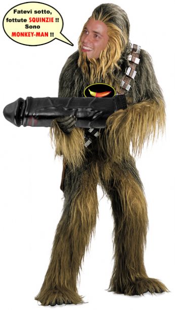 "Tu, farabutta donnicciola che hai sacrificato la felicità del tuo compagno per un nuovo membro, ora goditi le immani proporzioni di quello artificiale di Monkey-Man!!"
