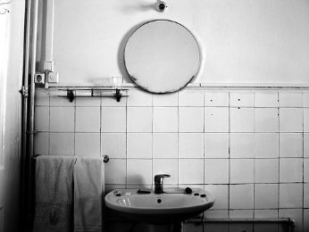 La cucina in disordine, un letto sfatto.
