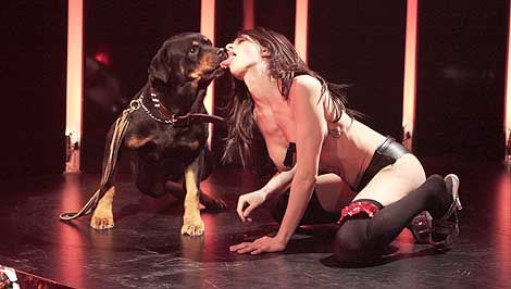 E poi la chiamano vita da cani. (Asia Argento si slinguazza appassionatamente il rottweiler in una scena del film "Go Go Tales" presentato fuori concorso al Festival di Cannes 2007)