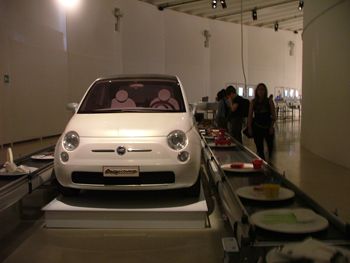 il giorno dopo siamo stati in triennale (sempre mentre il dayn lavorava ) e ho visto la stupenda mostra sul design italiano. eccone una diapositiva (prototipo della nuova 500 + tapisroulant con progettini)