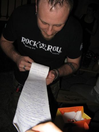Marco legge il bigliettino d’auguri mio e di Sbabby....