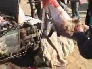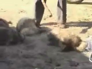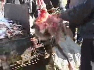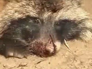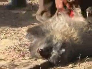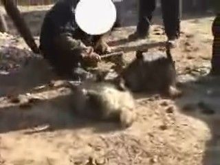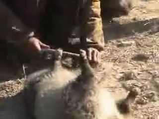 Si procede poi a tagliare tutte e quattro le zampe con un’accetta. L’animale è ancora vivo. Deve restare vivo il più a lungo possibile, pare che così la pelliccia resti più morbida