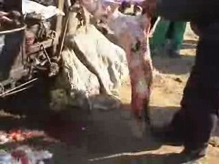 La pelle viene lentamente rimossa per intero, e la carcassa dell’animale viene gettata su un cassone, insieme alle altre. Povera creatura, ha raggiunto la pace, finalmente, pensiamo quando seguiamo le immagini che scorrono sul video