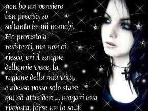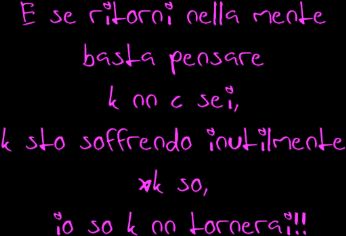 PERCHE DICIAMOCI LA VERITA NON E CAMBIATO PROPRIO NIENTE DA ALLORA..NO E K ORA FINGO E PRIMA MAGARI ERO PIU SINCERA CON ME STESSA E CON GLI ALTRI,-VORREI K SABATO NON FOSSE MAI FINITO PERCHE SAPEVO DI FARTI MALE CON LA MIA FREDDEZZA E INDIFFERENZA,SAPEVO DI FARE MALE ANCHE A ME MA QUESTO PASSA IN SECONDO PIANO,IO PASSO IN SECONDO PIANO XK MI ANNULLO QUANDO ANCHE SOLO PER UN ATTIMO TU RITORNI A FARE PARTE DI ME E QUESTO MI FA UNA RABBIA ASSURDA..MA E LA VERITA...E PERCHE TU ABITUATO A CAMBIARNE UNA AL GIORNO DOPO4MESI SEI ANCORA SOLO??FORSE PERCHE SAI K NON SARA PIU LO STESSO O FORSE PERCHE COME HAI DETTO A ME AVEVI BISOGNO DI STARE SOLO...BOH...NON IMPORTA PIU DI TANTO..SO SOLO K MANCA TUTTO DI TE,DENTRO E INTORNO A ME.........UCCIDIMI TI PREGO SOLO COSI POTRO LASCIARTI ANDARE......