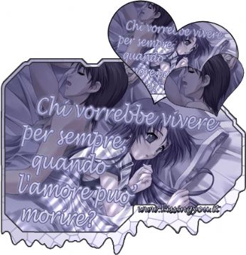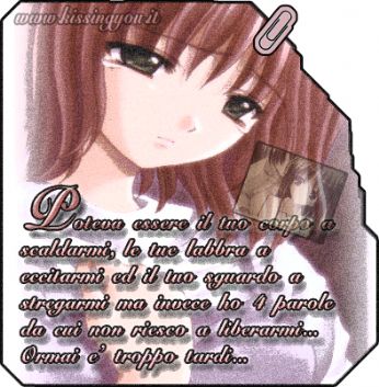![]() ![]() ![]() ![]() ![]() ![]() ![]() ![]() ![]() ![]() ![]() ![]() ![]() ![]() ![]() ![]() ![]() ![]() ![]() NON C’E NIENTE CHE NON FAREI PER AVER SOLO UN ALTRA POSSIBILITA DI GUARDARE NEI TUOI OCCHI E VEDERCI ANCORA RIFLESSO IL NOSTRO AMORE![]() ![]() ![]() ![]() ![]() ![]() ![]() ![]() ![]() ![]() ![]() ![]() ![]() ![]() ..se c’e un motivo trovalo con me,senza ingranaggi senza chiedere perche..dentro ai miei vuoti puoi nasconderti...le tue paure addormentale con m..se c’e un motivo..."LA NOSTRA CANZONE"![]() ![]() ![]() ![]() ![]() ![]() ![]() mercoledì 3 gennaio 2007 - ore 20:56 giornata tipo1:mi sveglio e ce troppo da fare non ce il tempo per pensare,giornata tipo 2:mi sveglio e le persone k amo mi sono accanto sto bene e non ho voglia di pensare,giornata tipo3:MI SVEGLIO ED E ATROCE PERCHE SBATTO CONTRO UNA VITA SENZA DI TE ED E PEGGIO K SBATTERE CONTRO UN MURO COMMENTA (0 commenti presenti) - PERMALINK mercoledì 3 gennaio 2007 - ore 11:24 che giornate sono ebbene si ho la febbre...fantastico...sono tutta tappata non riesco a respirare e mi soffio il naso piu o meno ogni2secondi...tra l’altro ieri sera il ragazzo con cui mi vedo da2mesi e mezzo mi viene a dire k non vuole stare male,k ha paura x cui meglio chiudere qui...bene tanto se lui ha paura io c’e l’ho4volte di piu..xk sinceramente non ho ancora superato un bel cavolo ma nonostante tutto,nonostante il mio carattere non mi permetta di sbilanciarmi e di dare certezze sono qui davanti a lui e gli dico k secondo me andra avanti k x quanto si puo stare male poi e sempre meglio k arrendersi,k c’e un futuro per noi..ma come sempre non vengo capita e sono stanca...per cui vaffanculo e basta... COMMENTA (0 commenti presenti) - PERMALINK sabato 9 dicembre 2006 - ore 12:25 ..9DICEMBRE... ..TANTISSIMI AD UNA PERSONA VERAMENTE UNICA E SPECIALE...TANTI AUGURI MAMMMMMMYYYYYYYYYYY LEGGI I COMMENTI (3) - PERMALINK mercoledì 6 dicembre 2006 - ore 17:57 ..PENSIERI.. QUANDO TI INNAMMORI E DIFFICILE NON PENSARE SEMPRE A QUELLA SERA,SEI CONVINTA K NON PUO SUCCEDERE UNALTRA VOLTA,SENTI IL CUORE K BATTE COME QUELLA SER,OGNI VOLTA K LO VEDI E QUANDO FINISCE PENSI K:NON TORNERA LA SUA TIMIDEZZA MENTRE ARROSSIVA PER OGNI TUA CAREZZA,NON TORNERA QUEL SUO MODO STRANO DI AMARTI SENZA MAI DIRE TI AMO,NON TORNERA E ORMAI NIENTE SI PUO PIU FARE,SARA IL TEMPO IL MEDICO DEL CUORE QUANDO LUI NON CI SARA,NON TORNERA LHAI CAPITO ADDESSO MA SENTI ANCORA IL SUO ODORE ADDOSSO,LIMMENSA GIOIA DEL VOSTRO AMORE,K SI TRASFORMA NEL TUO DOLORE,NON TORNERA E NON SERVE STARE A PENSARE K DORA IN POI TUTTO PUO ANDARE SOLO K MALE.... ![]() COMMENTA (0 commenti presenti) - PERMALINK mercoledì 6 dicembre 2006 - ore 14:38 ..k palle.. ma come si fa a trovare un cavolo di lavoro...ho bisogno della mia autonomia finanziaria...ci sono in progetto troppe cose:come le estencion,le unghie finte calcolando k dal nervoso ormai...,il guardaroba nuovo,un altro tatuaggio e magari anche un altro piercing...uffi datemi dei soldi... LEGGI I COMMENTI (2) - PERMALINK martedì 5 dicembre 2006 - ore 14:28 ..SI CAMBIA.. UN PO DI TEMPO FA QUALCUNO MI HA DETTO K SE NON FUNZIONA COSI BISOGNA CAMBIARE QUALCOSA ED ECCOMI QUI,TORNATA AL BICOLORE,NERO SOPRA E ROSSO SOTTO E SI...SONO CAMBIATA IN TANTE ALTRE COSE E QUESTO UN PO MI SPAVENTA,IL FATTO DI CAMBIARE PER LENNESIMA VOLTA MI IMPIETRISCE,MI IMPIETRISCE ANCHE IL FATTO DI SENTIRMI ANCORA VIVA E DI PROVARE NUOVE EMOZIONI QUESTA VOLTA SENZA DI LUI... LEGGI I COMMENTI (2) - PERMALINK giovedì 30 novembre 2006 - ore 10:59 ***BENE*** Diciamo k un po me le cerco le cose..ma non pensavo k quel gg mi rispondesse,e soprattutto non pensavo k saltasse lallenamento per me...mandiamomi in confusione...k poi k confusione lui non torna e io sto gia costruendo qualcosa con qualcunaltro...oh la...(credici) LEGGI I COMMENTI (11) - PERMALINK mercoledì 29 novembre 2006 - ore 14:25 ***se adesso te ne vai*** GUARDAMI NEGLI OCCHI ORA STO PER DIRTI CHE NON AVRO PAURA DI RESTARE SENZA TE,SE ADESSO TE NE VAI NON ME NE FREGA NIENTE,DOMANI E UN ALTRO GIORNO RICOMINCERO..E NON AVRO RANCORE QUANDO PARLERO DI NOI,NASCONDERO I DOLORE COME NON HO FATTO MAI,MA NON MI DIRE ADESSO CHE TI DOVREI CAPIRE,PERDONAMI MA IO NON TI PERDONERO..SE ADESSO TE NE VAI E FAI CROLLARE IL MONDO SU DI ME,ADESSO TE NE VAI ED IO NON VIVO PIU,LO SO MI ABITUERO A CAMMINARE SENZA AVERTI ACCANTO,NON E COSI PER TE CHE LO SAPEV GIA..LULTIMA VALIGIA E POI TUTTO CAMBIERA E GIA QUALCUNO ASPETTA PER PORTARTI VIA DI QUA,SPERO SOLTANTO K QUESTA VOLTA SIA PER SEMPRE,MA QUANTO MALE FA DOVERTI DIRE CHE..SE ADESSO TE NE VAI,NON CI SARA PIU POSTO DENTRO ME,TI GIUO DORA IN POI NON SO PIU K SEI,TRASCINA VIA CON TE LE TUE INCERTEZZE E LA TUA IPOCRISIA MA IL MALE CHE MI FAI NON PUOI PORTARLO VIA,DIVENTERA UNO SCUDO CON IL QUALE MI DIFENDERO DA TE E ADESSO SBATTI FORTE QUELLA PORTA VIA DA ME..E MALEDICO IL GIORNO CHE CI HA UNITO E QUESTO K TI VEDE ANDARE VIA,NON MI RIMANE CHE UN SALUTO,ABBASSERO LA TESTA E COSI SIA..SE ADESSO TE NE VAI E FAI CROLLARE TUTTO SU DI ME TI GIURO DORA IN POI NON SO PIU K SEI,SE ADESSO TE NE VAI TI CHIEDO SOLO NON VOLTARTI MAI PERCHE NON CI SARO SE UN GIORNO TORNERAI...GUARDAMI NEGLI OCCHI ORA STO PER DIRTI K MENTRE TU MI LASCI IO RINASCO SENZA TE.. COMMENTA (0 commenti presenti) - PERMALINK lunedì 27 novembre 2006 - ore 14:33 ..QUELLO K SENTO.. Inizierei con questa frase che ci sta proprio a pennello"IERI HO CAPITO K E DA OGGI K COMINCIO SENZA TE"...ebbene si e questo k penso da un po di giorni,sei morto per me,sei morto quel giorno troppo brutto per poterlo dimenticare e troppo triste da poterlo ricordare...SEI MORTO,e cosi tutto quello k ti ho dato,tutto quello k tu hai dato a me e tutto quello k abbiamo vissuto assieme...sei morto xk non posso fare altrimenti,perche e questo k tu vuoi e ti aspettavi da me,vedi non ti ho deluso nemmeno questa volta...sei morto perche non sono riuscita ad essere piu forte di ogni tua perplessita e perche non me lo hai lasciato essere...e cosi a