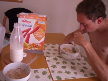 Alla fine poi è passato tutto, ci siamo riposati ed abbiamo cominciato a pensare ad una buonissima colazione delle ore 15. Per unestate in linea e tonica non cè niente di meglio che far colazione con latte crudo del distributore (che non faceva muuuuuuuuuuu quando versava il latte ufi) e gli special K albicocche e pesche. Ecco una foto della colazione dei campioni