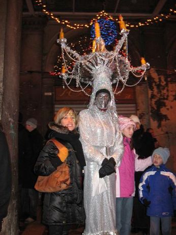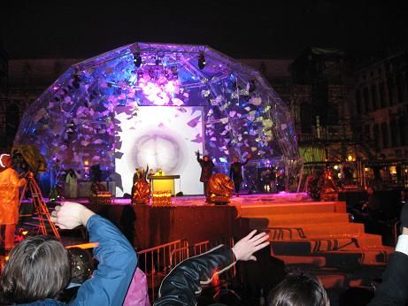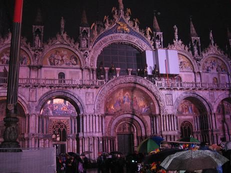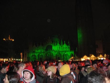 Poi, tutto ad un tratto.., si spengono le luci sulla piazza, si accendono gli amplificatori e le luci stroboscopiche, la corrente arriva alle casse.., e tutta San Marco diventa una Mega-Discoteca, il tutto sotto una bella pioggerellina..