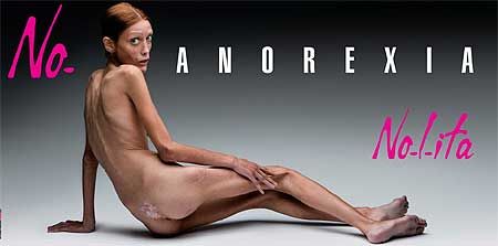 Questo è il soggetto che Oliviero Toscani noto fotografo ha scelto per la sua ultima campagna pubblicitaria... lanoressia che brutto male, il male che colpisce lanima.Come fa una ragazza a volere a tutti i costi raggiungere questo stadio di autodistruzione solo dio lo sa