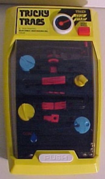 - "TRICKY TRAPS" fantastico, altro che i giorchi di oggi! Aveva un solo bottone e faceva il rumore che assomigliava a quello di un trattore. SCOPO DEL GIOCO: far arrivare le palline alla fine del percorso senza farle cadere fuori pista. COLORE: rigorosamente giallo! CE LAVEVO: sì