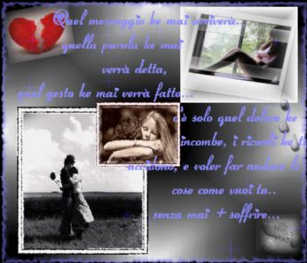 la cosa importante è sfogare il propio dolore, e poi spaccare cn il pugno ben teso quel muro di sofferenza ke la vita ti ha costruito davanti al tuo cammino, davanti al tuo percorso....di vita!!!oggi si soffre, domani pure, ma dopodomani??? no!!!dopodomani finalmente si vede un piccolo raggio entrare da quella spaccatura sul muro, quella stessa spaccatura ke tu stessa sei riuscita a fare, xke finamente sei riuscita, si, sei riuscita a reagire, a nn gettare la spugna! finalmente qlk1 altro è riusciuto a ridarti il sorriso ke ti era stato strappato via assieme al tuo cuore, al tuo essere, alla tua persona!!!