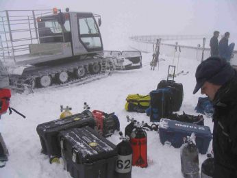 DOPO 1ORA E MEZZA DI STRADA FRA FUNIVIA, SEGGIOVIA, CAMMINATA E GATTO DELLE NEVI SI SCARICANO LE ATTREZZATURE SUL LAGO GHIACCIATO, A DX, K NENANCHE SI VEDE...