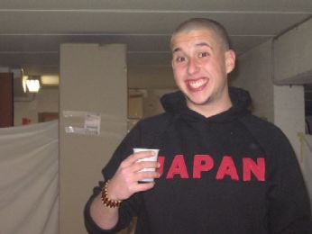 intanto nella festa cominciava ad aleggiare un’aria strana (no non avevo scoreggiato) ....gino cominciava ad avere strani deliri....il motivo è semplice.....gino hai voluto avere la scritta della martini? dovevi comprarti il martini rosso?comunista adesso te lo bevi merda.....soltanto che lo stronzetto ha bevuto tutte le altre cose tralasciando il martini.....gino non dire che l’hai bevuto perchè l’1 sera era più di tre quarti la bottiglia....ho controllato. io non mi ero ancora praticamente accorto che gino fosse della festa me ne stavo appartato il più delle volte con il mio amico fabio che in questa diapositiva cerca di fare il serio...