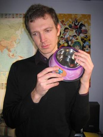 Io che regalo al Paolo una ciotola per il suo gatto che nel frattempo è morto.