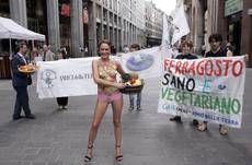 MILANO - Un blitz ambientalista senza veli capitanato dalla conduttrice televisiva e showgirl Micky Bet per spiegare a tutti i milanesi che la dieta vegetariana è "buona, sana e, soprattutto, sexy". Lanchorwoman di tg NakedNews, non nuova ad iniziative di questo tipo, si è presentata oggi pomeriggio in piazza San Babila, nel centro di Milano, coperta solo da un paio di slip e alcuni ortaggi assieme ai membri delle associazioni ambientaliste Gaia e Amici della terra per proporre liniziativa Ferragosto vegetariano