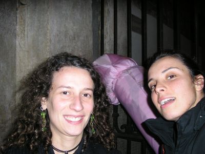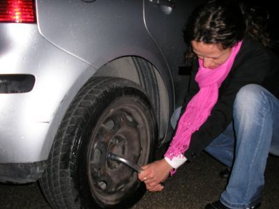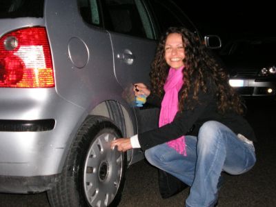 La Ire (io) saggiamente dice SUBITO: ok, lasci qui la makkina (eravamo con quella della tati), andiamo a piedi fin casa mia (sarà un km e mezzo) e poi ti lascio la makkina finchè non metti a posto la gomma. Ma lei, testarda, vuole provare a cambiare la gomma! IO: "ma dai, ma sei matta? ma guarda che è pericoloso. Io non mi fiderei a salire su un’auto che ha una gomma cambiata da me!" E lei: "ma dai, proviamo! Sai che soddisfazione avremo dopo?" Io: "ma secondo te ce la facciamo?" Lei:" ma sì sì, adesso chiamo mio moroso e ci facciamo spiegare!". Chiama: non risponde. Chiamo io Franz, non risponde. Chiamo Albe: non risponde ...ben..... (in + piove). Finalmente Seba risponde e ci spiega. Proviamo: