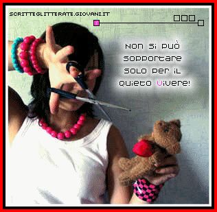 Non sono una rosa, ma a volte pungo come se avessi le spine, altre invece, mi sento fragile come i suoi petali ... Non sono la luna, ma a volte la mia luce è così tenue che a malapena riesco a illuminare i profili, altre invece, riesco a far emozionare anche un cuore... Non sono la pioggia, ma a volte cadendo spengo anche un incendio ,altre volte, disseto i campi aridi dove non cresce più nulla. Non sono il vento, ma a volte distruggo le cose più fragili, altre invece, spazzo via ciò che non serve più. Non sono il mare, ma a volte porto malinconia, altre invece riesco a far sognare. Sono una donna ... a volte riesco a farti maledire il cielo , altre invece, riesco a farti perdere nell’eternità di un brivido.... martedì 26 agosto 2008 - ore 15:06 NON SI PUò SOPPORTARE SOLO PER QUIETO VIVEREEEE!!!!!!!! ![]() ![]() pima di altri fraintendimenti: QUESTO POST è RIFERITO A TUTTO QUELLO CHE PUò SUCCEDERE IN OGNI EPISODIO DELLA VITA....il fatto di averlo scritto non significa necessariamente che mi stia riferendo a qualcuno in particolare, anzi, è più che altro riferito a QUALCOSA....in questo momento al lavoro in particolar modo...!!!!!!!!!!!!!!!! LEGGI I COMMENTI (6) - PERMALINK venerdì 22 agosto 2008 - ore 15:43 a te... COMMENTA (0 commenti presenti) - PERMALINK venerdì 22 agosto 2008 - ore 09:17 quanto bello era il lettone però.... ![]() COMMENTA (0 commenti presenti) - PERMALINK giovedì 21 agosto 2008 - ore 17:29 Adria.... COMMENTA (0 commenti presenti) - PERMALINK giovedì 21 agosto 2008 - ore 15:28 LIBERI LIBERI - vasco rossi Ci fosse stato un motivo per stare qui ti giuro sai sarei rimasto sì son convinto che se fosse stato per me adesso forse sarei laureato e magari se "lei"... fosse stata con me adesso.... ...sarei sposato! Se fossi stato, ma non sono mai stato così; insomma dai adesso sono qui! vuoi che dica anche se soddisfatto di me in fondo in fondo non sono mai stato "soddisfatto" di che ma va bene anche se qualche volta mi sono sbagliato Liberi liberi siamo noi però liberi da che cosa chissà cosè?.......chissà cosè! Finché eravamo giovani era tutta unaltra cosa chissà perché?.......chissà perché! Forse eravamo "stupidi" però adesso siamo "cosa"... che cosa....che?.....che cosa...se!..?... "quella voglia", la voglia di vivere quella voglia che cera allora... chissà dovè! ........chissà dovè!? Che cosè stato cosè stato a cambiare così? ...ti giuro che, sarei rimasto qui.... vuoi che dica anche se soddisfatto di me in fondo in fondo lo sono mai stato "soddisfatto" di che ma va bene anche se.... se alla fine il passato è passato! Liberi Liberi siamo noi però liberi da che cosa chissà cosè,....chissà cosè! ...e la voglia, la voglia di ridere quella voglia che cera allora chissà dovè?!....chissà dovè! cosa diventò, cosa diventò quella "voglia" che non cè più cosa diventò, cosa diventò che cosè che ora non cè più cosa diventò, cosa diventò quella "voglia" che avevi in più cosa diventò, cosa diventò e come mai non ricordi più..... COMMENTA (0 commenti presenti) - PERMALINK giovedì 21 agosto 2008 - ore 10:22 OGGI HO VOGLIA DI.... ![]() ![]() ![]() LEGGI I COMMENTI (1) - PERMALINK lunedì 18 agosto 2008 - ore 14:00 eh si.... PROPRIO PROPRIO BELLA LA CROAZIA!!!!! ne è valsa davvero la pena.... LEGGI I COMMENTI (3) - PERMALINK mercoledì 13 agosto 2008 - ore 11:35 oggi parto per POREC - CROAZIA... ![]() ![]() ![]() NON SEMBRA NIENTE MALE DA QUESTE FOTO.... ![]() ![]() SPERIAMO SIA CARINO COME NELLE FOTO.... LEGGI I COMMENTI (8) - PERMALINK lunedì 11 agosto 2008 - ore 11:14 FERIEEEEEEEEEEE!!!!!!!!!! finalmente sono a casaaaa!!!!!!!! da oggi metto il cervello in stand-by per una settimana.... ![]() COMMENTA (0 commenti presenti) - PERMALINK sabato 9 agosto 2008 - ore 12:06 basta lavoro.... VOGLIO ANDARE A CASAAAAAAAAAAAAA!!!!!!!!!!!!!!! COMMENTA (0 commenti presenti) - PERMALINK > > > MESSAGGI PRECEDENTI |