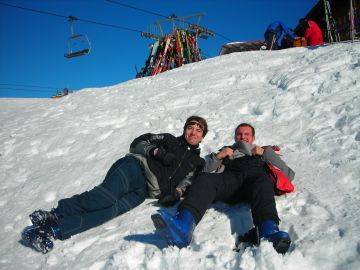 , la più clamorosa alla fine caricato dall’incitamento degli altri "dai, dai, vai così!", zizzagata di corsa la discesa, ultimi 50 metri al trguardo, ed ecco, non poteva mancare la catuta finale.. in conclusione le rotule e il ciapet lasciati lungo la montagna. Mario da parte sua, si è gustato bene le piste, già come un proiettile, tagliando la strada a una signora da cui si è preso una bella sgridata!