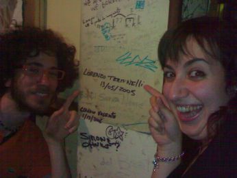 per ricordare questa serata, non poteva non esserci una foto, dei due passeggeri dei posti retrostanti della topo-macchina, che indicano la firma di uno dei loro artisti preferito al Vapore di Marghera ...