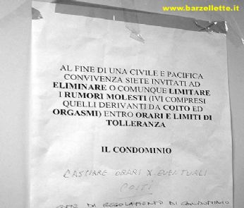![]() grazie biankaneve ![]() TUTTI POSSIAMO FARE QUALCOSA.... ![]() WWW.MAISHA.IT mercoledì 30 novembre 2005 - ore 13:23 BUON ONOMASTICO A TUTTI GLI ANDREA ! ...SOPRATTUTTO AL MIO ! COMMENTA (0 commenti presenti) - PERMALINK martedì 29 novembre 2005 - ore 14:24 PAPA BAVARESE ![]() COMMENTA (0 commenti presenti) - PERMALINK venerdì 25 novembre 2005 - ore 19:14 ...è già venerdì e io no... COMMENTA (0 commenti presenti) - PERMALINK venerdì 25 novembre 2005 - ore 10:52 BUONGIORNO A TUTTI!!! Un napoletano, un siculo e un veneto sono in un bar a bere una birra insieme. Il napoletano beve la sua birra e allimprovviso lancia il bicchiere in aria, impugna una pistola e spara colpendo il bicchiere. Poi dice: "A Napoli i bicchieri costano così poco che non utilizziamo mai lo stesso bicchiere due volte!" Il siculo (ovviamente impressionato dellazione dellamico napoletano)beve la sua birra,lancia il suo bicchiere in aria, tira fuori la lupara, spara frammentando il bicchiere ancora in volo e dice: "A Palermo abbiamo così tanta sabbia per produrre vetro che non dobbiamo mai usare due volte lo stesso bicchiere." El veneto fa finta di niente, alza la sua birra e la beve con gusto, lancia il bicchiere in aria, impugna il fucile da caccia e spara al napoletano ed al siculo. Poi uscendo dal bar dice al barista: "A Treviso gavemo cusì tanti teroni ke no dovemo mai bevar coi stessi più de na volta..." COMMENTA (0 commenti presenti) - PERMALINK giovedì 24 novembre 2005 - ore 10:01 SPECIALE YOGA ...YOGA IN INDIA... ![]() ..E YOGA IN IRLANDA!!! ![]() LEGGI I COMMENTI (1) - PERMALINK martedì 22 novembre 2005 - ore 22:44 CHI E SECONDO VOI LA TALPA?? ...secondo me è beatrice bocci... LEGGI I COMMENTI (1) - PERMALINK lunedì 21 novembre 2005 - ore 17:08 VITA DA CONDOMINIO ![]() LEGGI I COMMENTI (2) - PERMALINK venerdì 18 novembre 2005 - ore 15:32 Stasera vado col mio love a vedere "Melissa P."... il libro lho letto... ora sono curiosa di vedere come hanno messo in scena il tutto... mi risulta che lhanno un po censurato e cambiato... vedremo! LEGGI I COMMENTI (6) - PERMALINK venerdì 18 novembre 2005 - ore 13:28 ![]() grazie D R A G O per il link!!! COMMENTA (0 commenti presenti) - PERMALINK giovedì 17 novembre 2005 - ore 19:24 CAZZOOOOOOO LEGGI I COMMENTI (2) - PERMALINK > > > MESSAGGI PRECEDENTI |