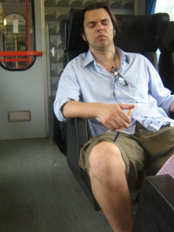 Il mio amico tega che dorme in treno con una penna in mano