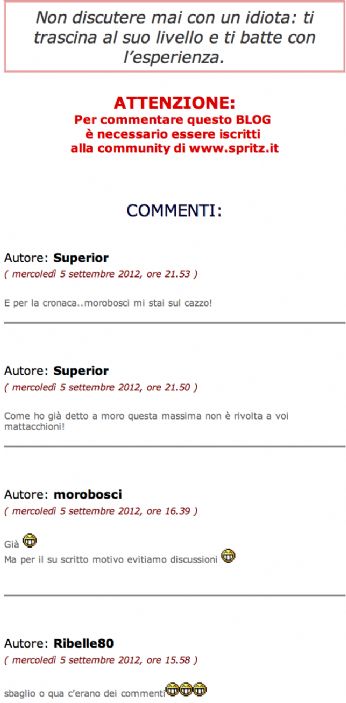 Questo sito non è più quello di una volta. Questo è lultimo post. Poi uscirò di qui e non tornerò più. Navigherò nel cyberspazio in cerca di nuovi lidi, cioè di nuovi siti. Speriamo non vogliano emigrare in molti da qui sennò rischiamo di ritrovarci tutti in uno stesso sito ancora una volta. Non fate nulla per trattenermi. Non servirà a niente.
