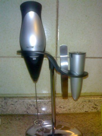 la macchinetta per fare la schiuma del cappuccino... che poi.. è il primo aggeggio partendo da sinistra, seguito da una pinzetta per prendere le zollette di zucchero e per finire un contenitore per mettere la cioccolata...