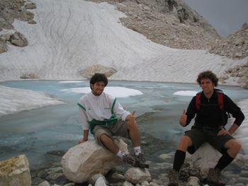 Ad ogni modo il panorama lassù (2900mt) era troppo una figata!! Locchio spaziava per decine e decine di kilometri (nubi permettendo) su un altopiano roccioso cosparso qua e la da laghetti e residui di neve; si poteva respirare unaria che manco ci si può sognare giù in pianura e gli unici suoni che si potevano sentire erano il vento che a tratti fischiava sulle orecchie e il ghiacciaio che si scioglieva a rivoli dacqua e andava a formare dei piccoli laghetti..