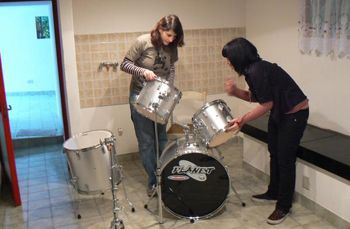 Dopo un pò di problemi per montare la batteria (avete a che fare con l’unica batterista che mette la grancassa rovescia per poi dire "C’è qualcosa di strano qui...") Sono riuscita a trovare una posizione stupenda, in cui potevo aprire le braccia!